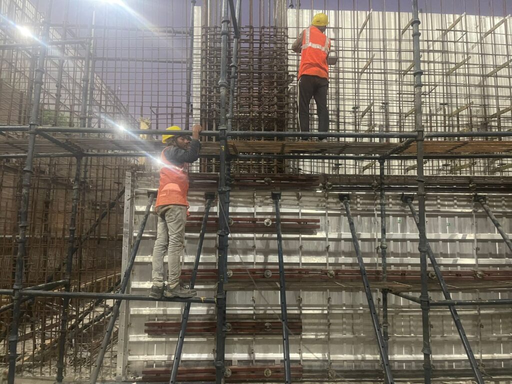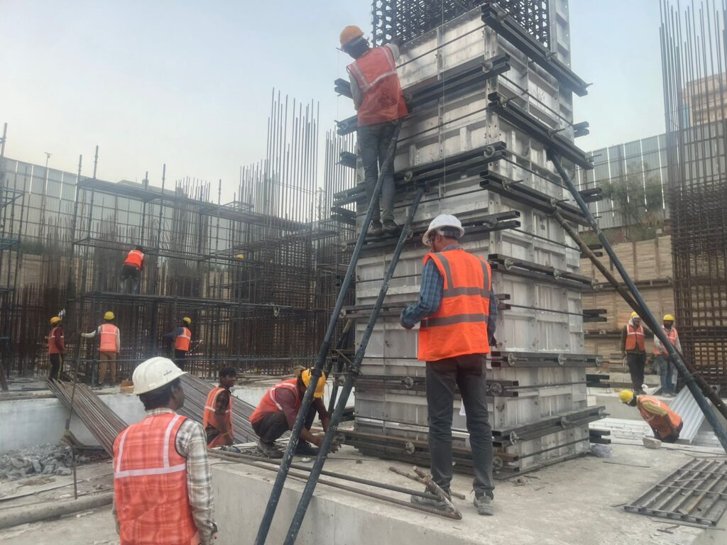 Shuttering work forms the backbone of structural precision. At Exotica One 32 Noida, RCC shuttering is executed under strict alignment protocols.